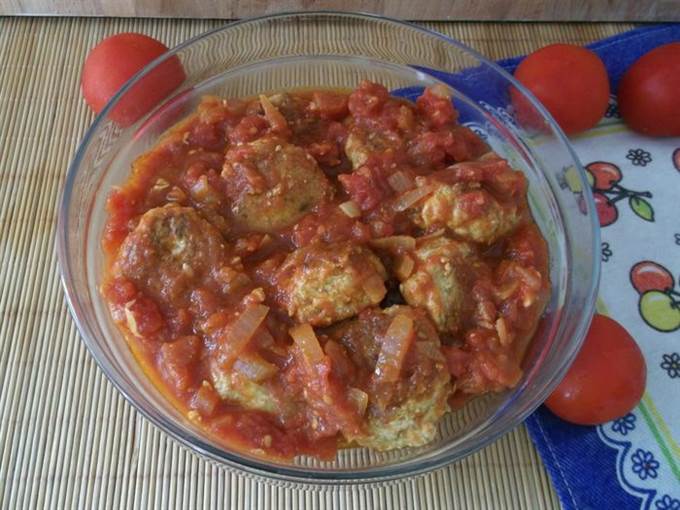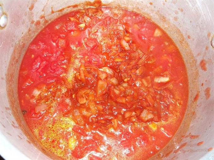 В оставшуюся половину добавить томатную пасту, немного обжарить, добавить консервированные в собственном соку, нарезанные кусочками томаты и оставить тушиться на маленьком огне не закрывая крышкой.соус должен быть густой!в конце соус посолить, поперчить, добавить сахар и сухой тимьян.