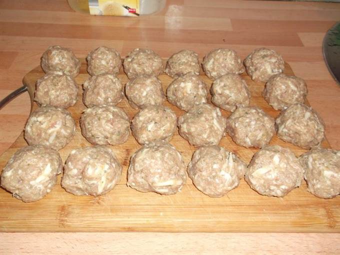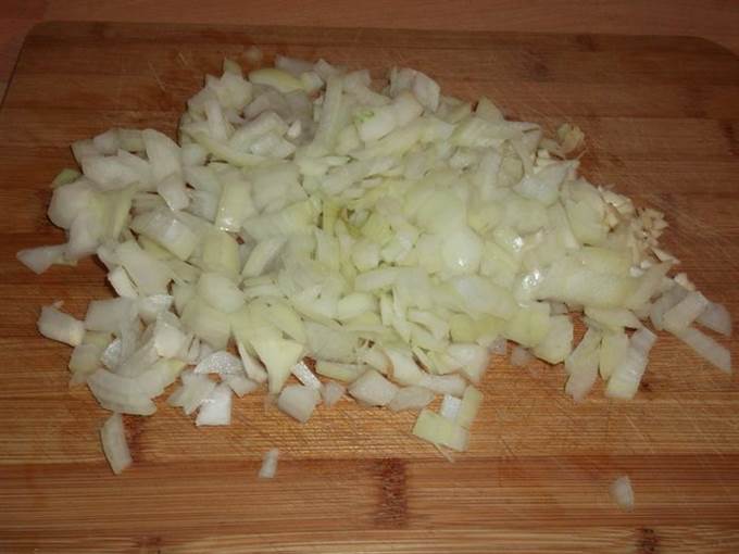 Мелко порезать лук и чеснок, обжарить до прозрачности в оливковом масле, половину добавить в фарш (у меня свинина с говядиной, но можно просто свиной или говяжий).