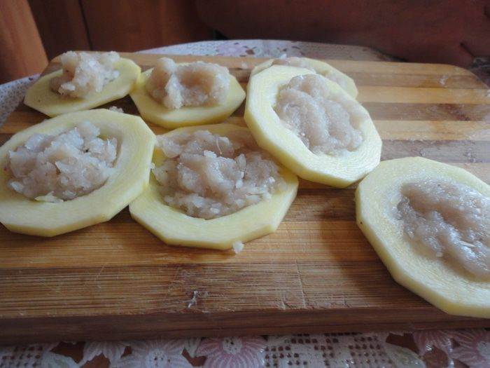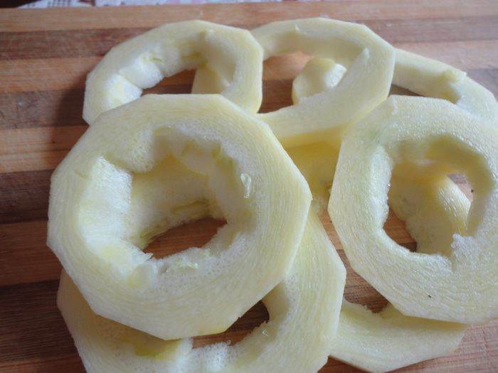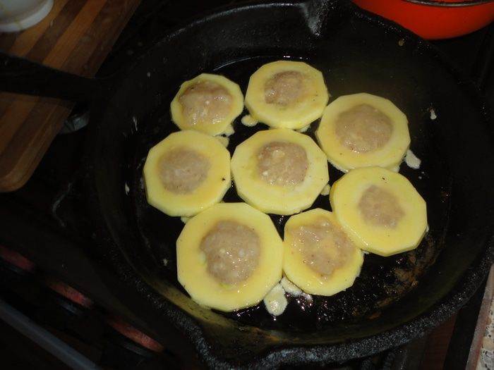• Обмакивать колечки с фаршем в кляр, жарить на растительном масле.