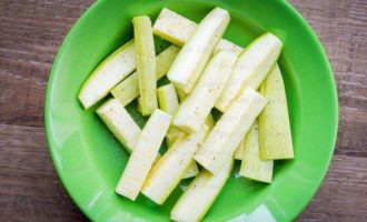 Кабачки нарезаем брусочками или кружочками, как вам больше нравится, присаливаем их. Через минут 10, когда они дадут сок, промакиваем бумажным полотенцем и присыпаем мукой.