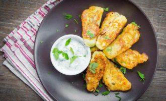 Обваленные в муке кусочки кабачка макаем в кляр и обжариваем на разогретом масле с обоих сторон до румяной корочки. Лучше это делать на среднем огне так, чтобы образовалась корочка и кабачок успел приготовится. Подаем с соусом из йогурта, соли и свежей зелени.