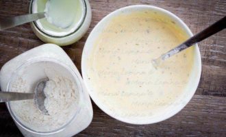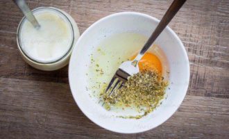 Приготовим кляр. В миске смешаем яйцо, соль, сушенные травы.