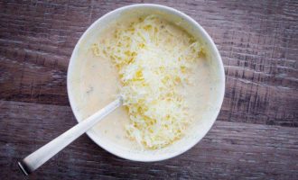 Натрем сыр на мелкой терке и добавим в кляр.