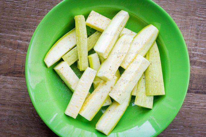 Кабачки нарезаем брусочками или кружочками, как вам больше нравится, присаливаем их. Через минут 10, когда они дадут сок, промакиваем бумажным полотенцем и присыпаем мукой.