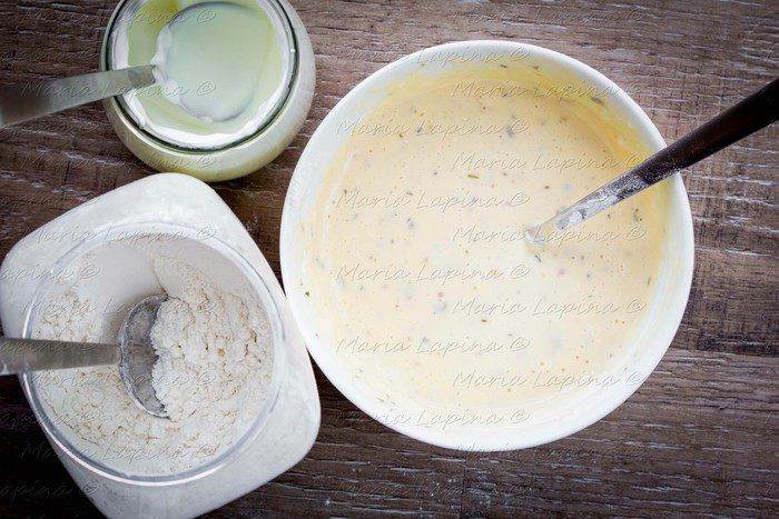 Всыпаем муку, помешивая. Тесто должно получится как густая сметана.