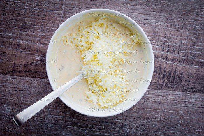 Натрем сыр на мелкой терке и добавим в кляр.