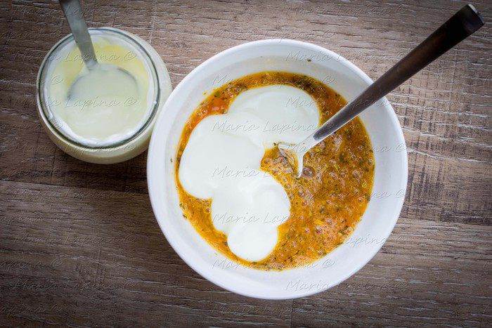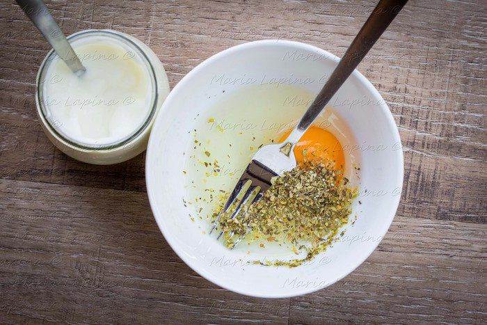 Приготовим кляр. В миске смешаем яйцо, соль, сушенные травы.