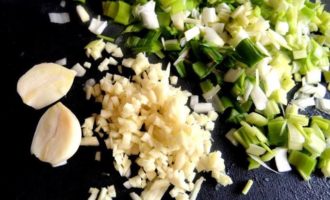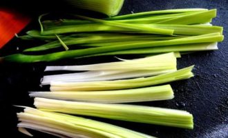 • Итак лук порей нарежем вдоль…, потом измельчим.