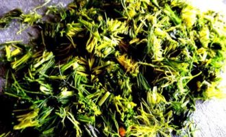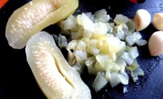 • Солёные огурцы очистить, если кожица грубая и тоже измельчить.