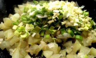 • Сначала потушить огурцы, потом добавить лук, чеснок.
