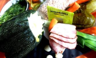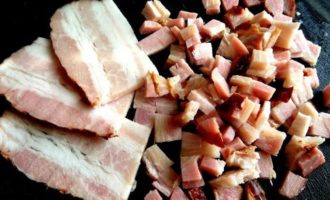 • Любое копчёное мясо (здесь жирок приветствуется!) нарезать кубиками.