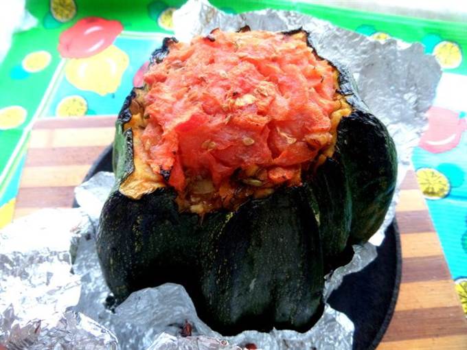 • Для сохранения сочности я нарезала помидоры и прямо с соком прилепила кусочками наверх, так и запекала чуть больше часа при 200°С. Когда зубочистка хорошо проходит в самой толстой стенке «бомбочки», тогда он готов!