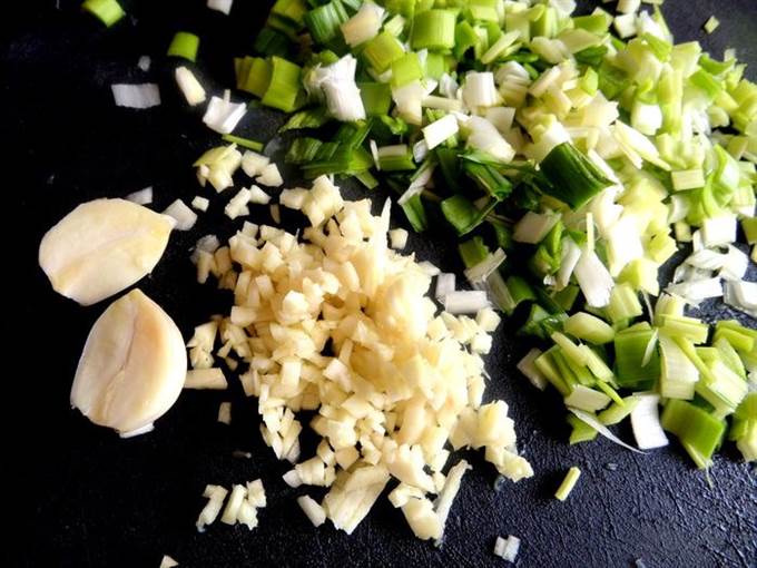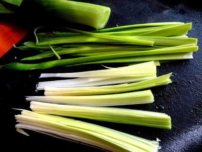 • Итак лук порей нарежем вдоль…, потом измельчим.
