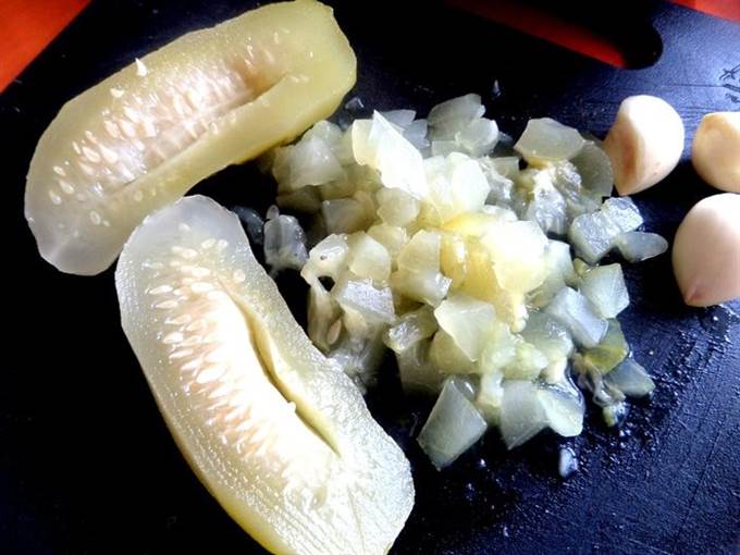 • Солёные огурцы очистить, если кожица грубая и тоже измельчить.