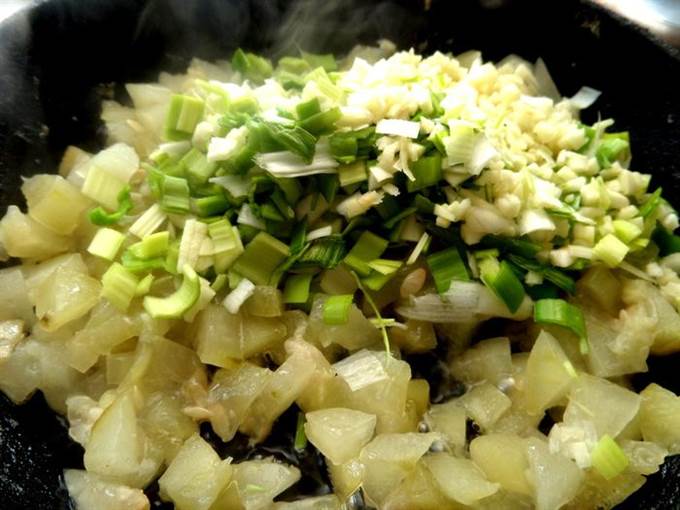 • Сначала потушить огурцы, потом добавить лук, чеснок.