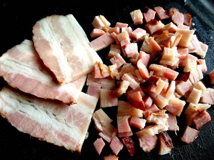 • Любое копчёное мясо (здесь жирок приветствуется!) нарезать кубиками.