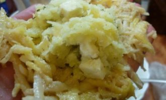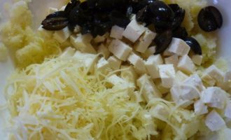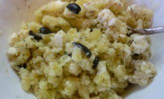 • В картошку добавить сливочное масло, порезанную на кубики брынзу, натертый сыр, порубить маслинки.