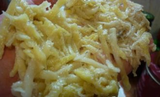 • Ну а теперь все очень традиционно: мочим ладошки, на одну тонким слоем раскладываем сырые картофельные лепесточки…