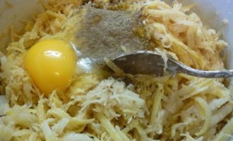 • Посолим, поперчим, добавим манку (можно заменить на панировочные сухари), чтоб лишнюю влагу вытягивали. и конечно яйцо для связки всех картофельных молекул. Перемешаем.