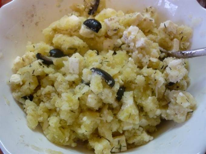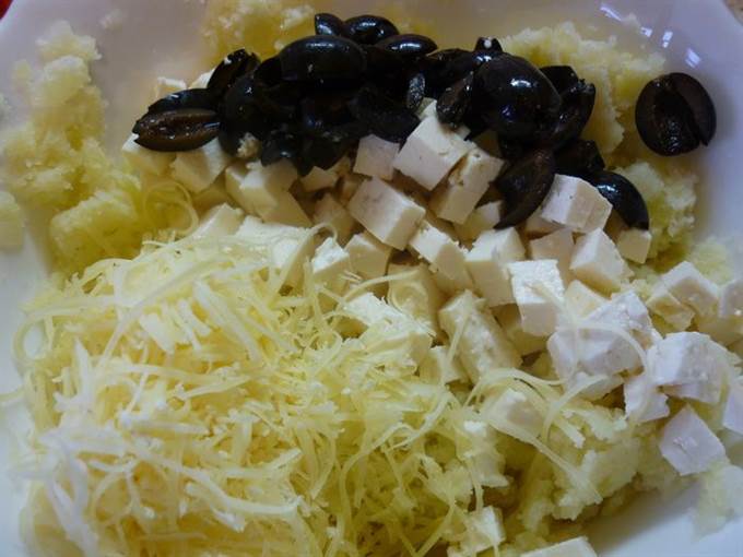 • В картошку добавить сливочное масло, порезанную на кубики брынзу, натертый сыр, порубить маслинки.