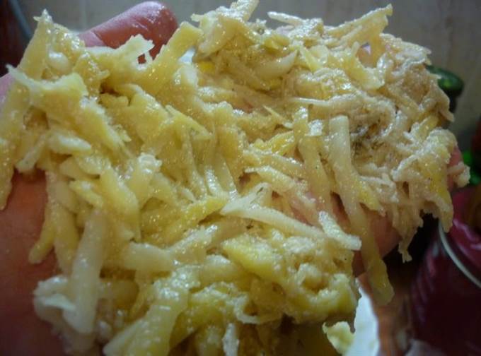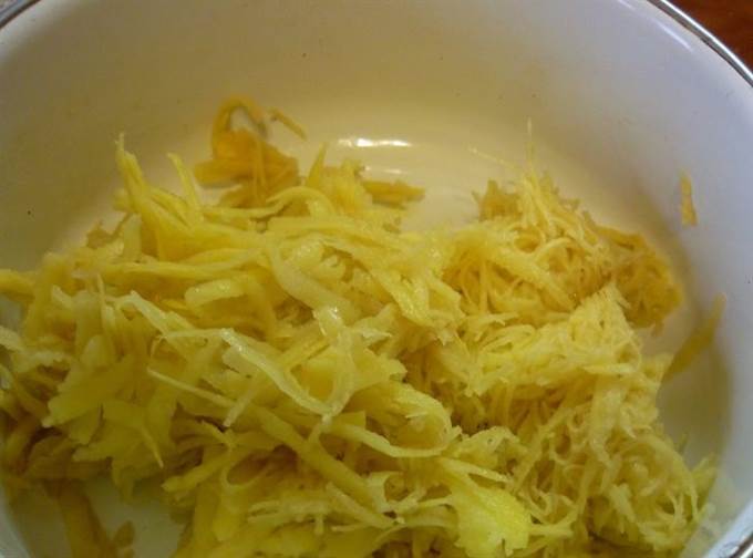 • Теперь об остальной картошке. Одну натираем на крупной терке, другую — на мелкой, чтоб фактура поверхности была поинтересней.
