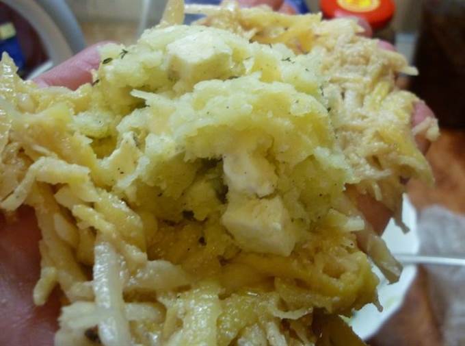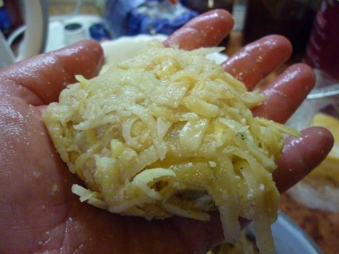 • Все залепляем. И вовсе нет беды, если начинка где-то проглядывает. Это даже интересно. По сути, картошка в картофельной панировке.