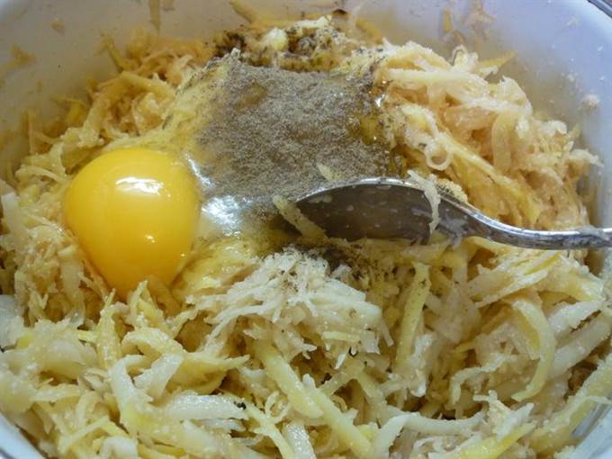 • Посолим, поперчим, добавим манку (можно заменить на панировочные сухари), чтоб лишнюю влагу вытягивали. и конечно яйцо для связки всех картофельных молекул. Перемешаем.