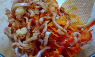 • Смешиваем кальмары, лук, овощи, добавляем приправы, чеснок пропущенный через пресс, сахар, уксус, соевый соус. Все хорошо перемешиваем.