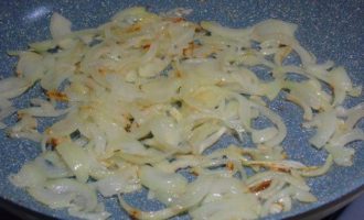 • Лук нарезаем полукольцами и отправляем обжариваться на растительном масле до золотистого цвета.