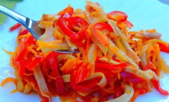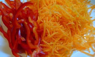 • Перец нарезаем соломкой, а морковь натираем, лучше всего на терке для корейской моркови.