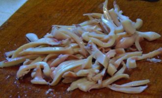• Кальмары очищаем, промываем и отвариваем 20-30 секунд в кипящей воде. Достаем и сразу же под холодную воду, а затем нарезаем полосочками.