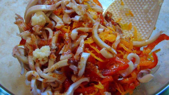 • Смешиваем кальмары, лук, овощи, добавляем приправы, чеснок пропущенный через пресс, сахар, уксус, соевый соус. Все хорошо перемешиваем.