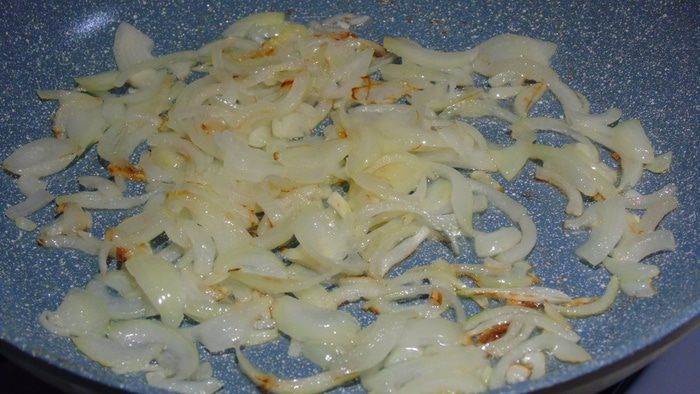 • Лук нарезаем полукольцами и отправляем обжариваться на растительном масле до золотистого цвета.