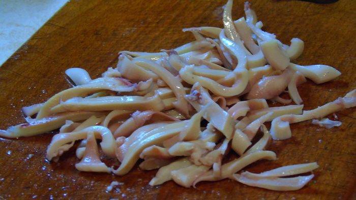 • Кальмары очищаем, промываем и отвариваем 20-30 секунд в кипящей воде. Достаем и сразу же под холодную воду, а затем нарезаем полосочками.