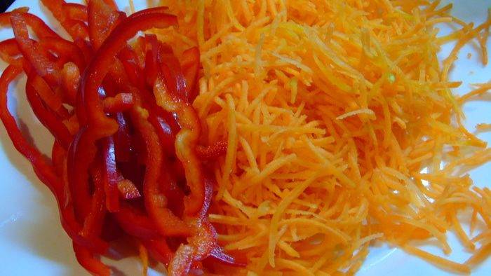 • Перец нарезаем соломкой, а морковь натираем, лучше всего на терке для корейской моркови.