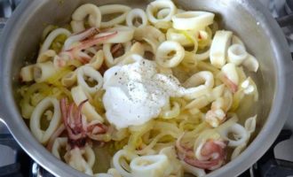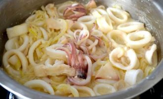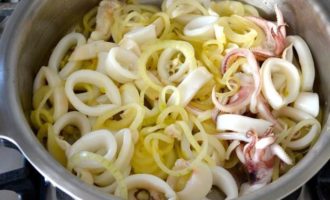 Затем добавить к луку кольца кальмаров. Накрыть крышкой и потушить пару минут.