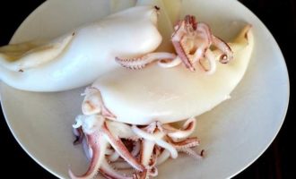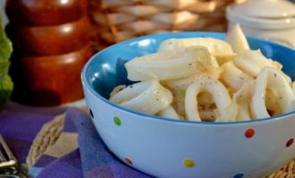 Достать кальмаров из кипящей воды и опустить в ёмкость с холодной водой. Очистить и нарезать кольцами.