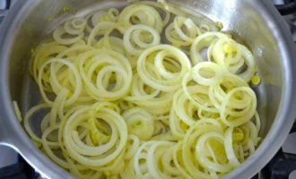 Репчатый лук также отчистить и нарезать кольцами. В сковороде разогреть растительное масло и обжарить на нем лук.
