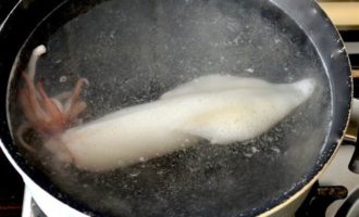 В кастрюлю налить воду и дать закипеть. Положить столовую ложку соли. Варить тушки кальмаров буквально по 1 минуте, помещая их поочередно в кастрюлю с кипящей водой.