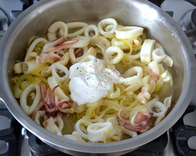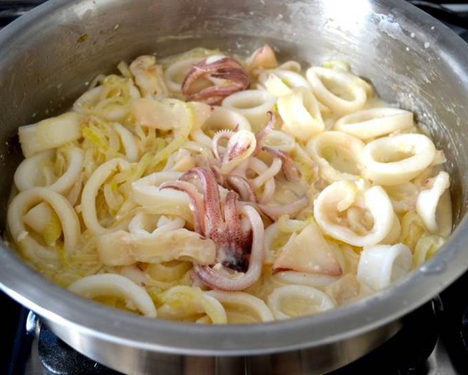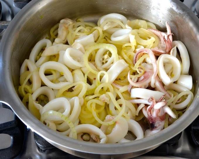 Затем добавить к луку кольца кальмаров. Накрыть крышкой и потушить пару минут.