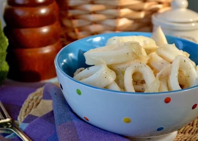 Достать кальмаров из кипящей воды и опустить в ёмкость с холодной водой. Очистить и нарезать кольцами.