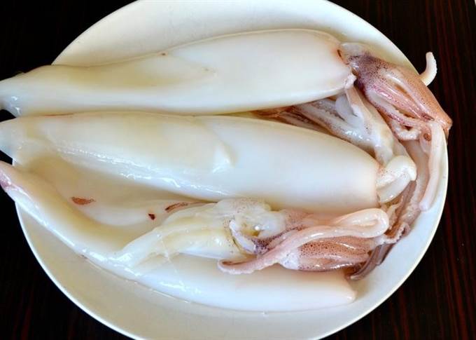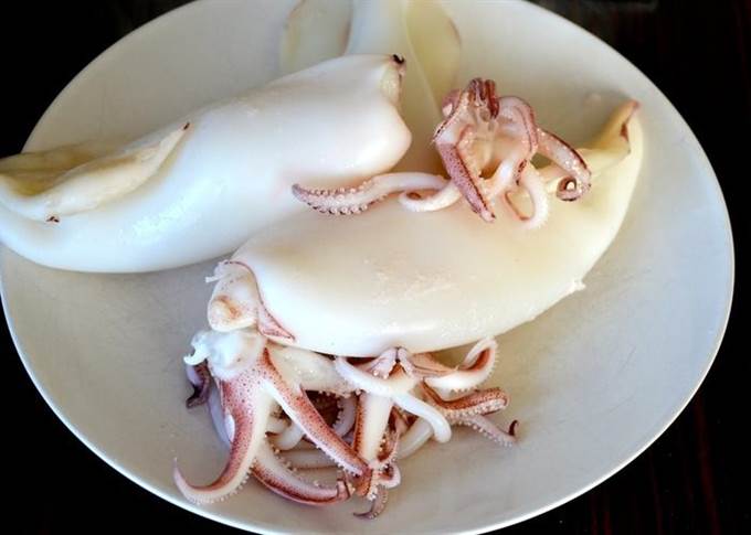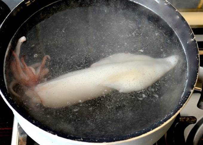 В кастрюлю налить воду и дать закипеть. Положить столовую ложку соли. Варить тушки кальмаров буквально по 1 минуте, помещая их поочередно в кастрюлю с кипящей водой.