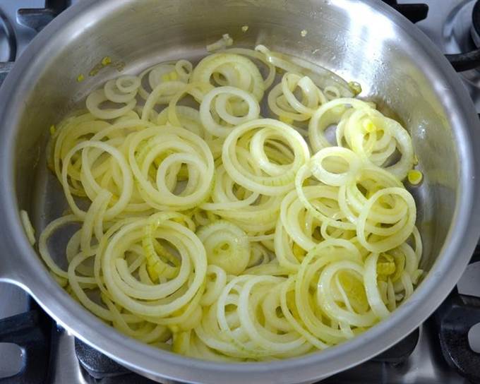 Репчатый лук также отчистить и нарезать кольцами. В сковороде разогреть растительное масло и обжарить на нем лук.