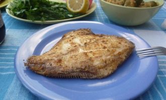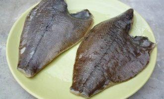 Камбалу средних размеров очистить от чешуи и внутренностей, убрать голову, затем хорошо промыть.