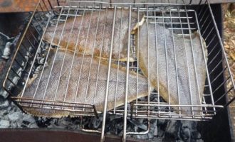 Далее решетку для гриля смазываем подсолнечным маслом и укладываем на нее нашу камбалу. -