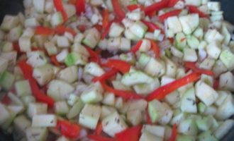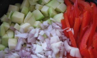 Лук и кабачки нарезать небольшими кубиками, перец красный сладкий нарезать пластинами, чеснок пропустить через пресс, посолить, поперчить.