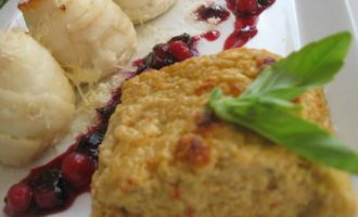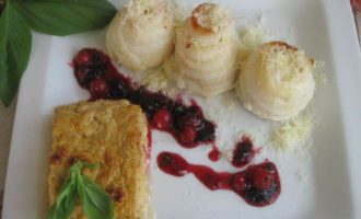 Приготовить соус. Выпарить на сковороде вино, лимонный сок, мед, воду до половины, добавить оливковое масло, смородину, измельченные листья базилика.