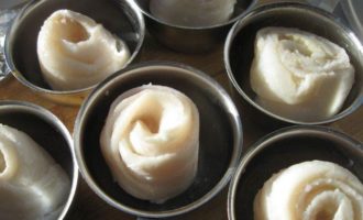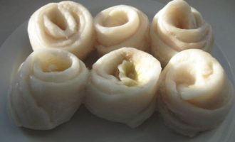 Филе камбалы свернуть в рулеты (лучше это сделать заранее и подморозить филе) или приобрести филе, уже скрученное рулетами.