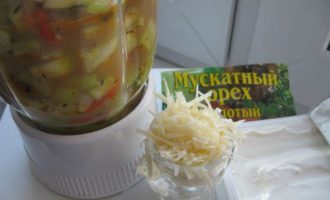 Сливки, молоко, творожный сыр, мускатный орех на кончике ножа смешать с измельченным луком и цуккини. Натереть сыр Пармезан, добавить к смеси.