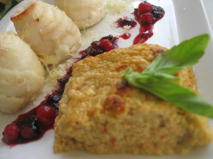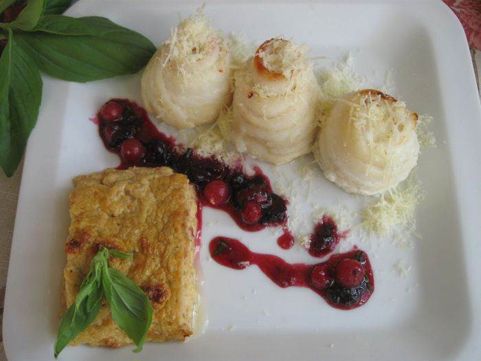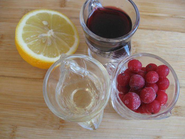 Приготовить соус. Выпарить на сковороде вино, лимонный сок, мед, воду до половины, добавить оливковое масло, смородину, измельченные листья базилика.